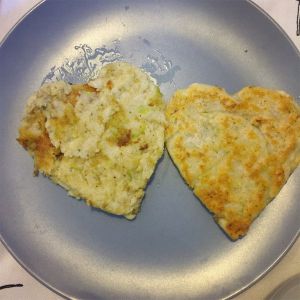 给孩子做个带造型的,用小勺子压平,小火煎黄,轻轻用铲子铲起,把模具拿开翻面继续煎