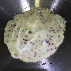 用平铲在锅中摊平煎成薄饼,可以卷菜吃