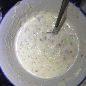 再次加入面粉水牛肉沫芝麻继续搅拌,这个程度就可以了