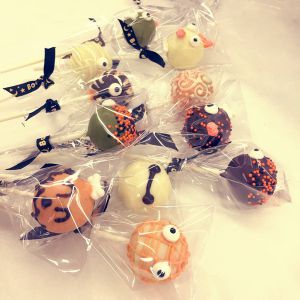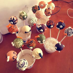 将搅拌好的蛋糕分成每20g一份,揉圆球状,融化巧克力,用棒棒沾取一点巧克力插入蛋糕球中固定(插进一半蛋糕球)放进冰箱冷藏10分钟,让蛋糕球固定好