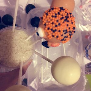 融化巧克力后让温度降到35度左右,旋转沾取巧克力溶液,均匀包裹蛋糕球,建议沾取包裹两次巧克力溶液,会变得很均匀,插入大米杯子中冷却固定。