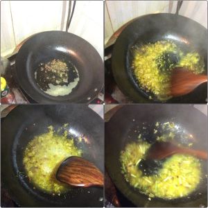 先炒花椒炒出香味 加入葱碎 姜碎 炒香 加入泡椒碎 炒出香辣味加入泡椒水接着炒