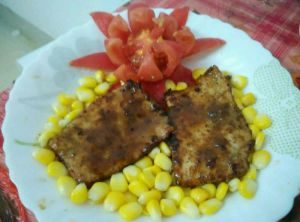 玉米粒事先剥下煮好备用,番茄也是事先雕切成花瓣状,猪排出锅装盘,玉米粒铺在猪排周围。