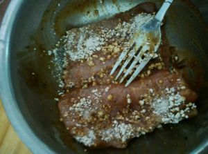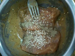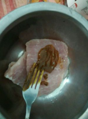 从猪腿肉割下一块瘦肉,再把这块瘦肉切成两片,薄度适中不要太厚也不要太薄,或者根据个人喜好,自己掌控。然后抹上黑椒酱汁。