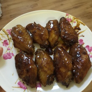 锅里放少量油,八角、姜炒香后倒入可乐,可乐开了之后,放入鸡翅,加少量盐、酱油,中火煮10分左右,大火收汁.