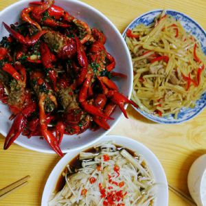 龙虾上桌喽(可挑选那种青红的龙虾,比较嫩个点)