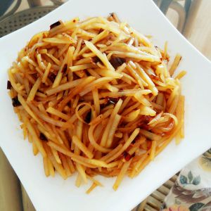 倒进土豆丝翻炒,加入酱油,盐,和醋,大火翻炒翻炒再翻炒,我用的平锅,这样不沾能炒的熟透