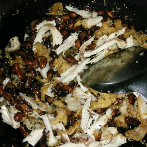 剩下的两个鸡腿用手撕成碎条,放到盘中备用