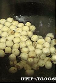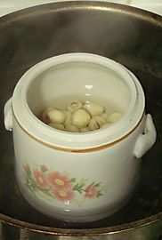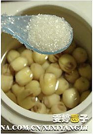 倒入罐盅内,加水盖过莲子,洒一勺白糖或冰糖。
