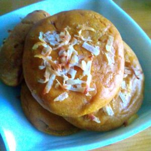椰丝稍微按压在南瓜表面。椰丝比较干,容易烤焦,最好用锡纸覆盖烤。