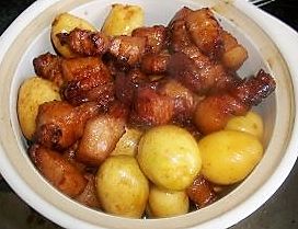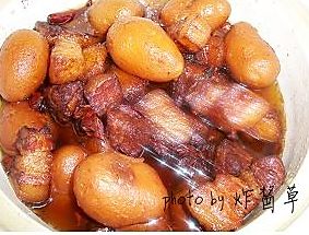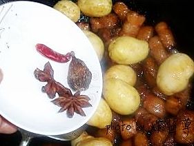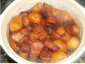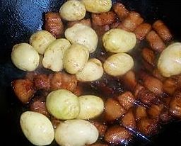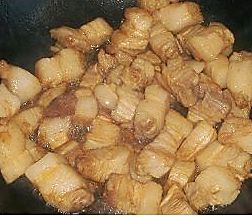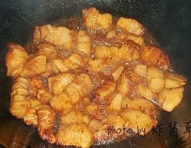 上色好的五花肉中依次倒入腐乳汁,红烧汁,料酒和醋