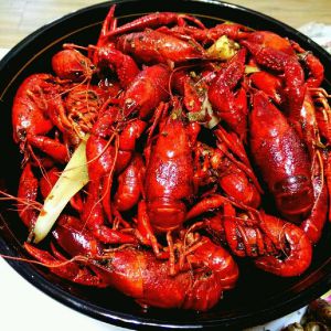 倒入小龙虾爆炒两分钟后加入适量开水、盐、糖,盖上锅盖中火闷十分钟左右;