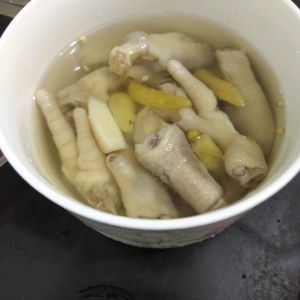 鸡爪捞出放入碗中,再加小米椒,泡椒水,姜片,食盐一勺,白醋一勺,最后加凉白开没过鸡爪。密封容器,放入冰箱,冷藏一夜。泡椒水就是你买的泡小米椒的水。