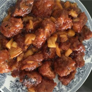 热锅,倒入食用油,放入姜片,黄菜椒,然后倒入前面炸好的排骨,调好的酱料,进行翻炒,3-5分钟左右倒入菠萝,不断翻炒,收汁,出锅