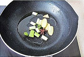 锅里放适量油,油热后,将葱姜、八角下锅爆香;