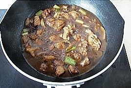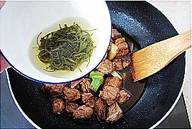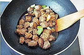 然后放入牛肉翻炒几下,加入1小勺白酒,加入1小勺生抽和老抽上色;