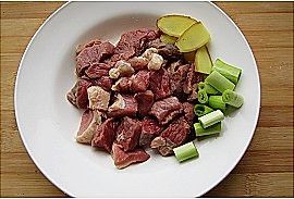 牛肉清洗干净,也切成块状,葱姜切片、切段;