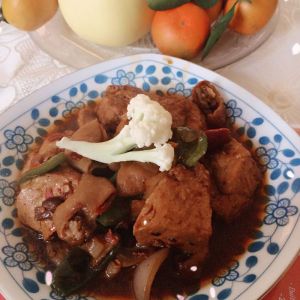 最后加入之前的洋葱块和青红辣椒块,翻炒一下,大功告成
