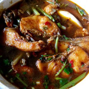 加入煎好的鱼段继续大火烧开,依次加入芹菜段,大葱再煮2分钟。(途中尽量不要翻动,避免鱼段破裂)