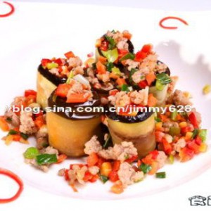 用茄子片将原料卷入做成茄卷放入提前预热200度的烤箱上下火烤5分钟取出装盘即可。