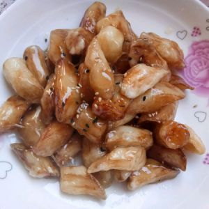 糖水冒泡粘稠快成糖稀时将山药倒入锅中