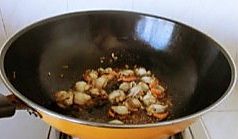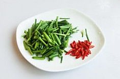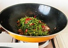 再下入韭葶、红椒翻炒,最后调入生抽、盐、鸡精翻炒均匀出锅