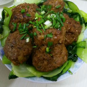 炸好后,可以将配菜,青菜清炒一下摆在盘子四周,为了点缀。将炸好的狮子头放入水中,加老抽,生抽,白糖,也注入水中,小火炖二十分钟,如果想汤汁浓稠,可以加水淀粉