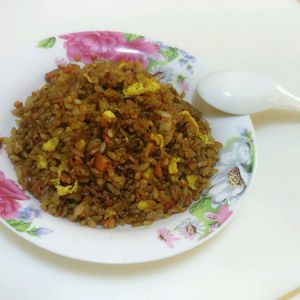再倒入一点油润锅,倒入火腿肠,炒出香味,倒入拌好的米饭!继续炒!(炒啊~炒啊~炒啊炒
