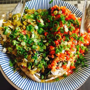 出锅撒上准备好小香葱,锅里放少量的油放入麻椒花椒爆香,捞出花椒麻椒把油淋在鱼头上就ok了。