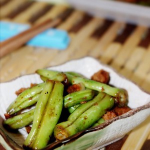 锅烧热,放入洗净、去筋、切段的四季豆;