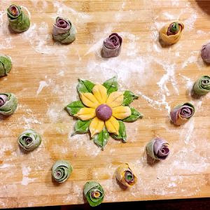 紫薯直接捏碎放入面粉内,倒入加了孝母粉的凉白开淡盐水,搅拌均匀,逐渐和成光滑的面团,南瓜面制作方法同紫薯面一样!同样醒面半小时以上