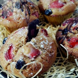 把黏糊入磨具再把草莓对半切,每个面糊里放两个,烤好之后用巧克力装饰即可。