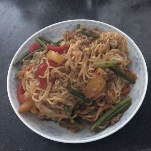 面翻散后加入辣白菜翻炒。如果自己想要补充其他蔬菜营养,可以根据口味适量增加,切忌不可添加汤汁多的食材,防止抢掉辣白菜的香味。