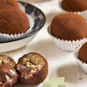 取一个面团中间加少量巧克力酱后搓圆,外面裹一层可可粉