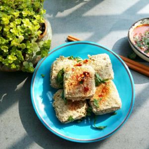 臭豆腐撒香菜,辣椒油,还可以沾着酱吃。