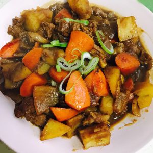牛腩炖酥烂后,加入一汤勺半老抽,一汤勺生抽,两小勺糖,适量盐,放入胡萝卜土豆洋葱,大火烧十五分钟,收汁。