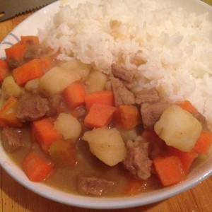 热锅先翻炒下土豆,加入牛肉,加调味料(盐、调和面、糖、少醋)翻炒几次,加水淹至离菜2厘米以上,盖上锅盖,小火慢煮至土豆、牛肉完全软(勤看着水,小心糊锅,适时加水),加入胡萝卜,加入适量咖喱块,翻两下,煮2分钟,可以密西西啦