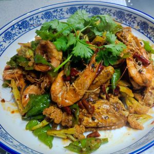 辣椒洗净切滚刀 菜花掰开洗净过水 姜蒜小米辣切颗粒放入干辣椒花椒备用 虾开背去虾线过水备用 鸡翅打花刀过水加入花椒料酒老抽煮熟备用