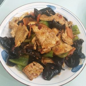 炒出红油后,依次加入配菜,不好熟的胡萝卜先放翻炒,然后是青尖椒翻炒去辣味,最后是木耳翻炒