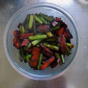 翻炒几下,香肠出现脆皮后,加入蒜苔