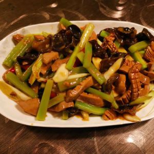 起锅烧油,油温6成(看到锅开始微微冒烟)下腰花,炒到翻白的时候,把大葱花椒泡椒段姜蒜片下锅一起翻炒,炒到料香味出来,下莴笋段和木耳,稍微翻炒两下,赶快把那个碗里面的汁倒进去,再炒半分钟不到,关火