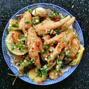 重起一锅水 ,将泡好的鸡爪放入锅中。加入葱、姜、八角、花椒、少许盐给底味。水来后打入浮沫后炖煮10~15分钟。鸡爪出锅后要用清水反复冲洗干净!