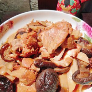 再把雷笋和香菇也放入锅中炒一下,然后盛到高压锅中