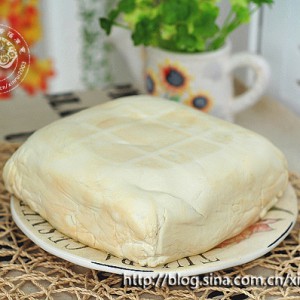 豆腐盒里垫上细纱布,把所有凝固的内酯豆腐都装入盒中。