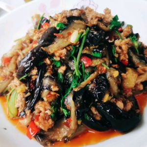 炒个一分钟,再倒入茄子,这中间我没有放盐,因为之前茄子已经抹了盐,豆瓣酱也是咸的