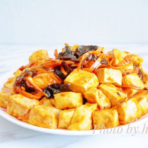 豆腐清洗干净,胡萝卜清洗干净去皮,木耳提前泡发清洗干净。