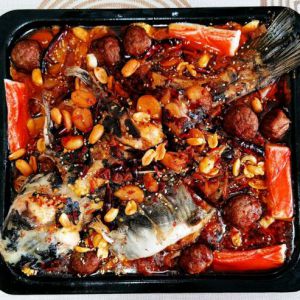 放上鱼,把锅里的汤汁倒入,撒上干红椒。浇上一勺滚烫的油。