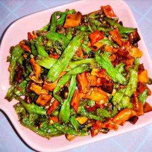 锅里倒油,放切好的蒜,干辣椒,花椒少许,炒出香味,放炸好的豆角,,再放盐,糖,生抽少许,翻炒均匀即可
