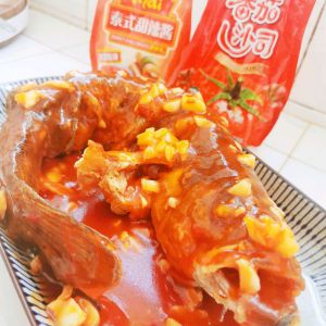 热锅凉油,下味好美泰式甜辣酱 番茄酱 砂糖翻炒冒泡,加入适量水 蒜蓉 盐翻炒,趁热浇到炸好的鲈鱼上