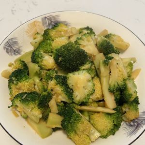 西蓝花焯水一分钟后,沥水。锅中倒油,放入葱蒜爆香。倒入西蓝花快速翻炒2分钟,放入一勺美味鲜,少量盐。出锅